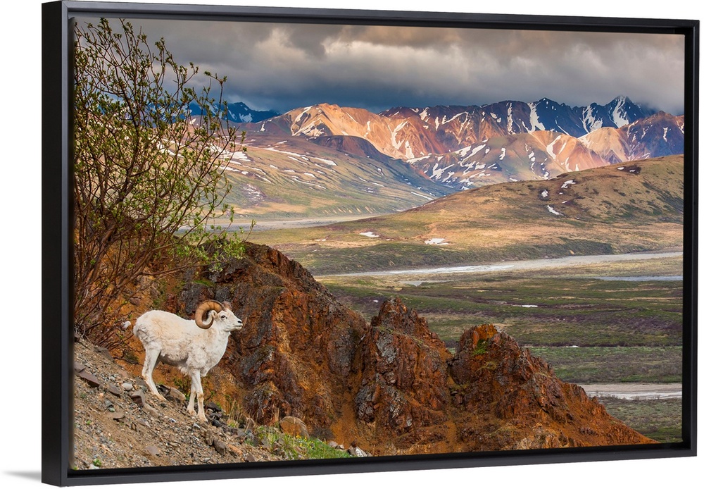 <p>Adult ram Dall Sheep on a hillside overlooking Polychrome Pass and the Alaska Range, Denali National Park.</p>