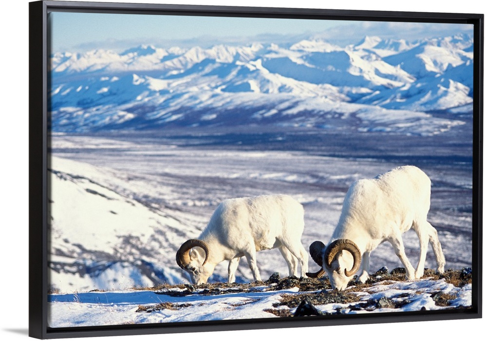 <p>Dall sheep (Ovis dalli) pair foraging on a snow-covered hillside in Denali National Park, Interior, Alaska.</p>