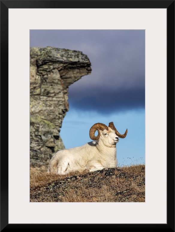 <p>Dall Sheep ram (Ovis dalli) in Denali National Park and Preserve in Interior Alaska in autumn; Alaska, United States of America</p>