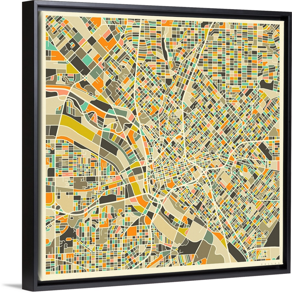 <p>Colorfully illustrated aerial street map of Dallas, Texas on a square background.</p>
