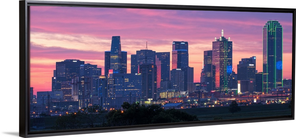 <p>A horizontal image of the Dallas, Texas city skyline with a brilliant sunset.</p>