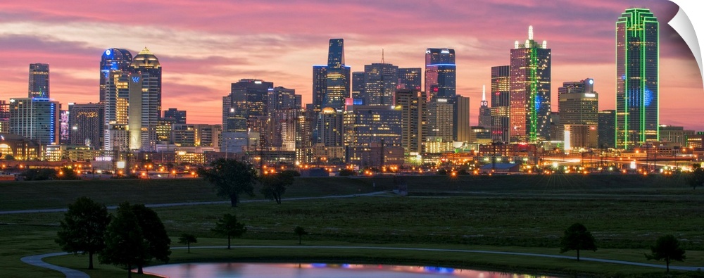 <p>A horizontal image of the Dallas, Texas city skyline with a brilliant sunset.</p>