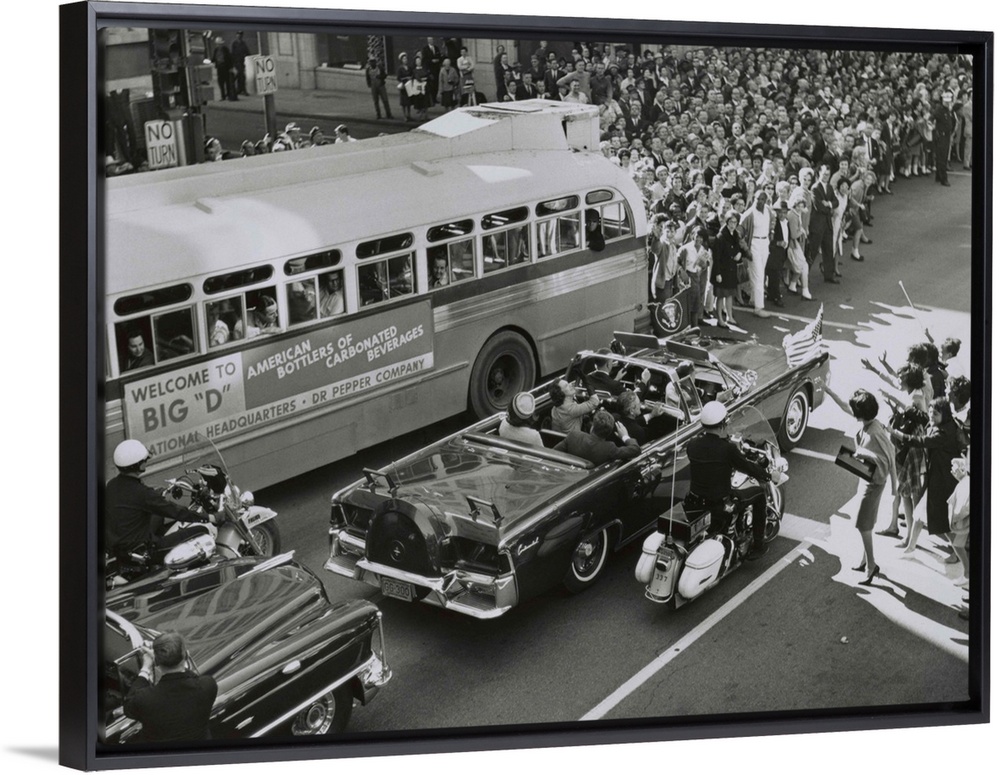 <p>Dallas crowds waving as President Kennedy's limousine drives through downtown Dallas. Texas Governor John Connally and his wife ride in the limousine's jump seats, with JFK and Jacqueline Kennedy in the back seat. Nov. 22, 1963.</p>