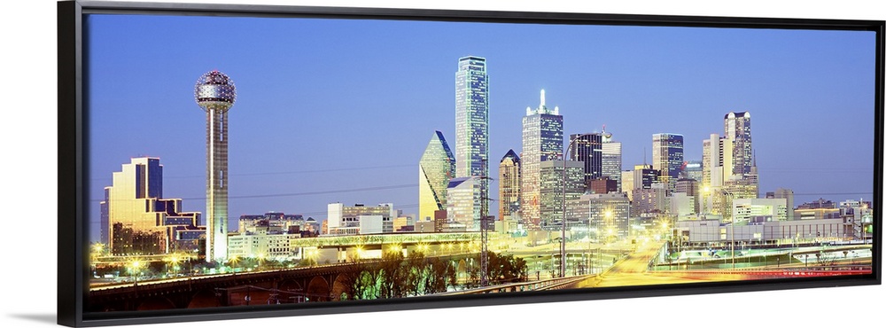 <p>Giant, landscape photograph of a highway road leading toward the lit up Dallas skyline against a blue sky, at dusk.</p>