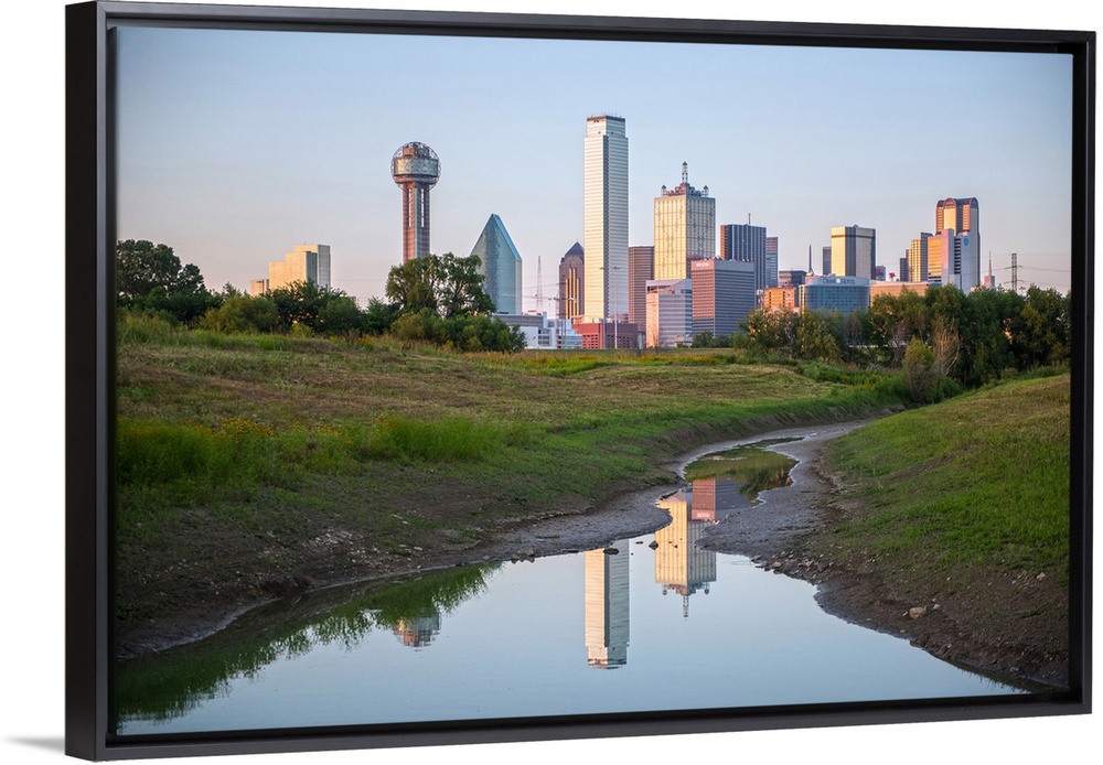 <p>A creek in the foreground of the Dallas Texas skyline.</p>