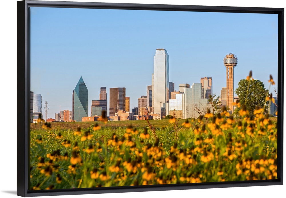 <p>A field of wild flowers in the foreground of the Dallas Texas skyline.</p>
