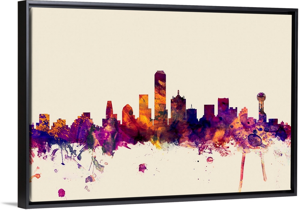 <p>Contemporary artwork of the Dallas city skyline in watercolor paint splashes.</p>
