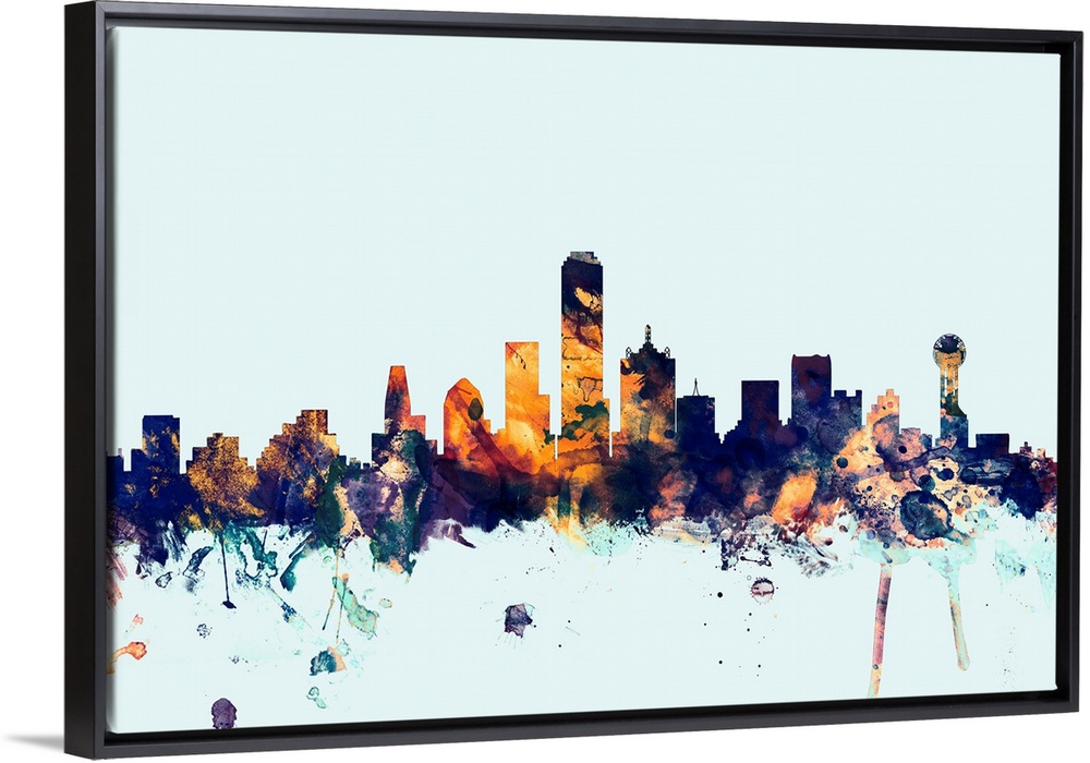 <p>Dark watercolor silhouette of the Dallas city skyline against a light blue background.</p>