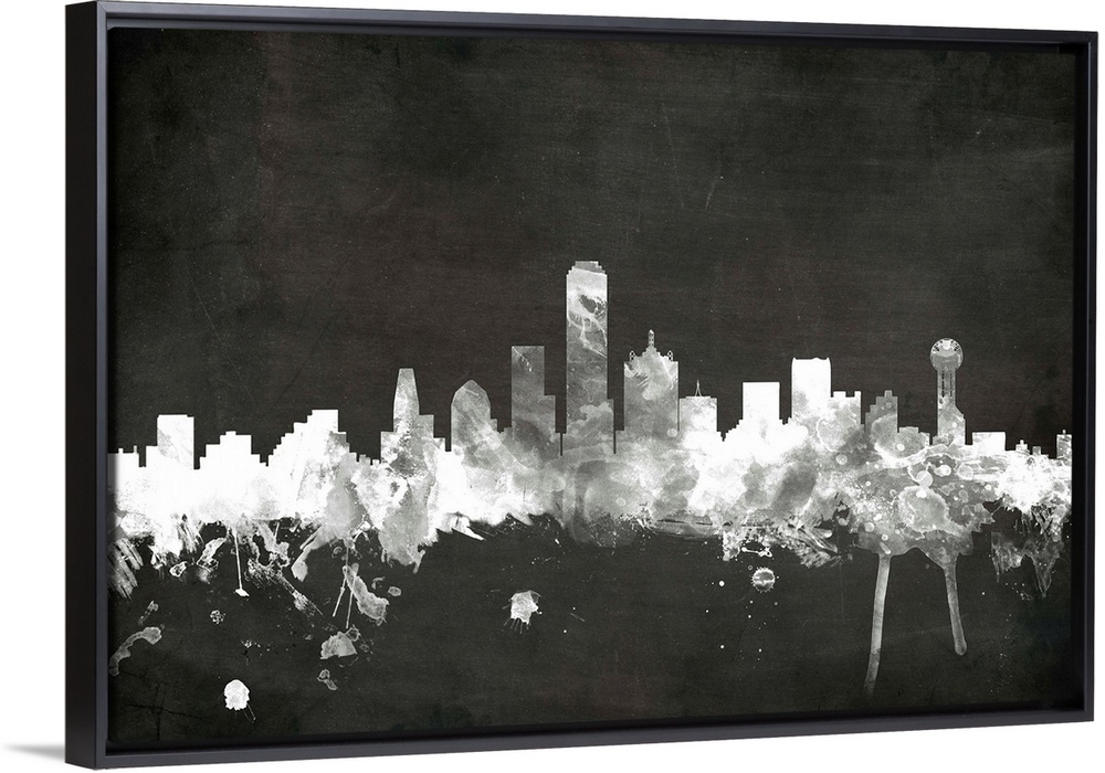 <p>Smokey dark watercolor silhouette of the Dallas city skyline against chalkboard background.</p>