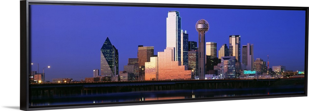 <p>A large panoramic piece that is a photograph of the Dallas skyline at dusk.</p>