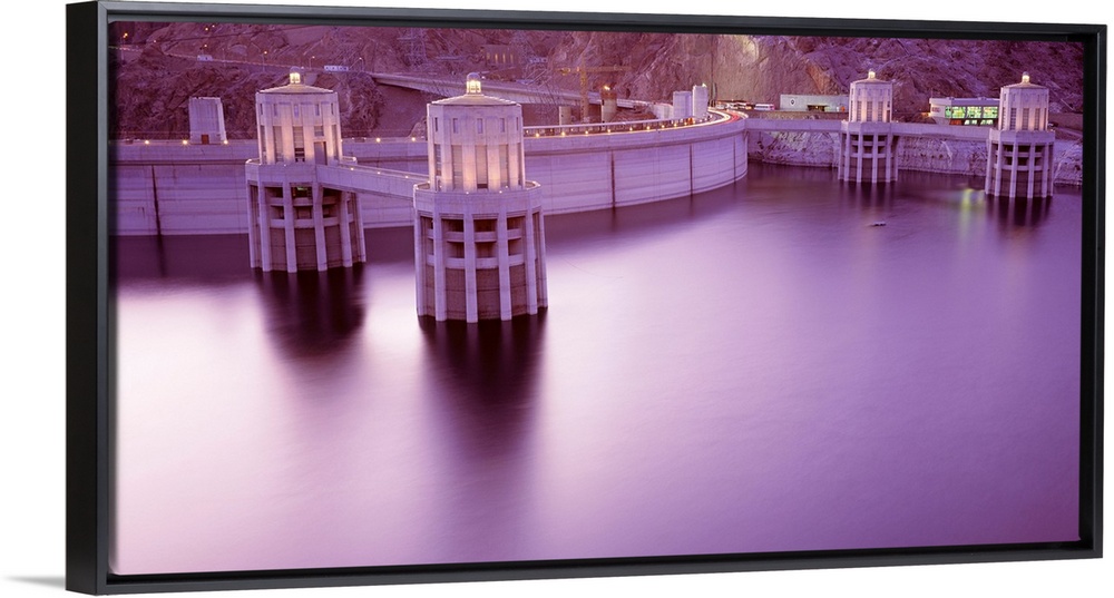 <p>Horizontal photograph of the still surface of an impounded lake at twilight next to a concrete arch-gravity dam.</p>
