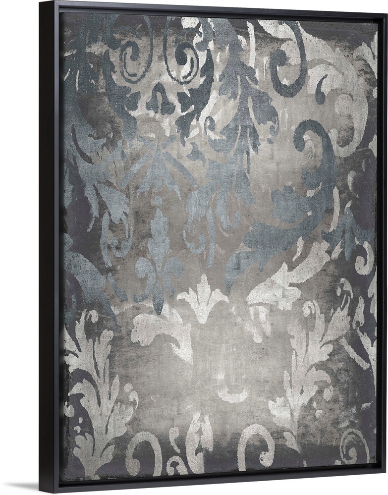 <p>Contemporary artwork featuring silver damask designs over a distressed background with a foil texture throughout.</p>