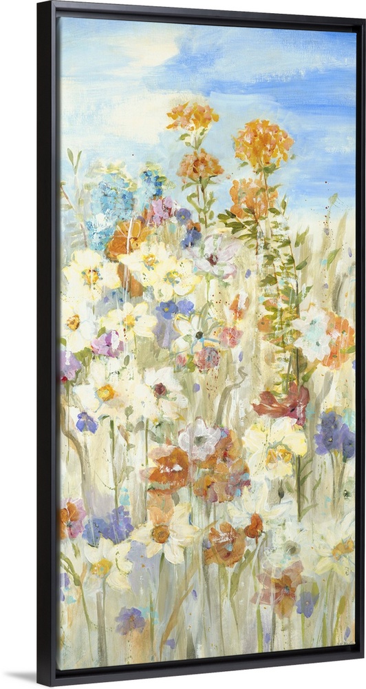 <p>Contemporary painting of a group of garden flowers rising from the ground on their long stems.</p>