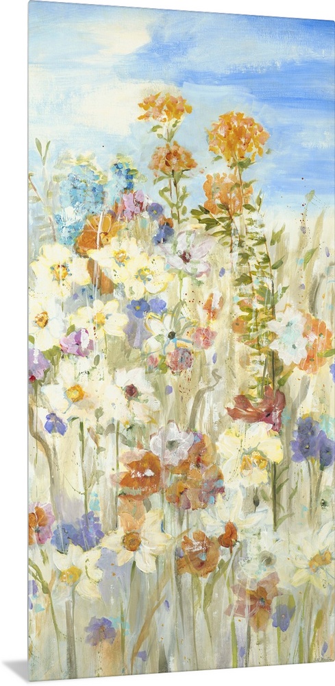 <p>Contemporary painting of a group of garden flowers rising from the ground on their long stems.</p>