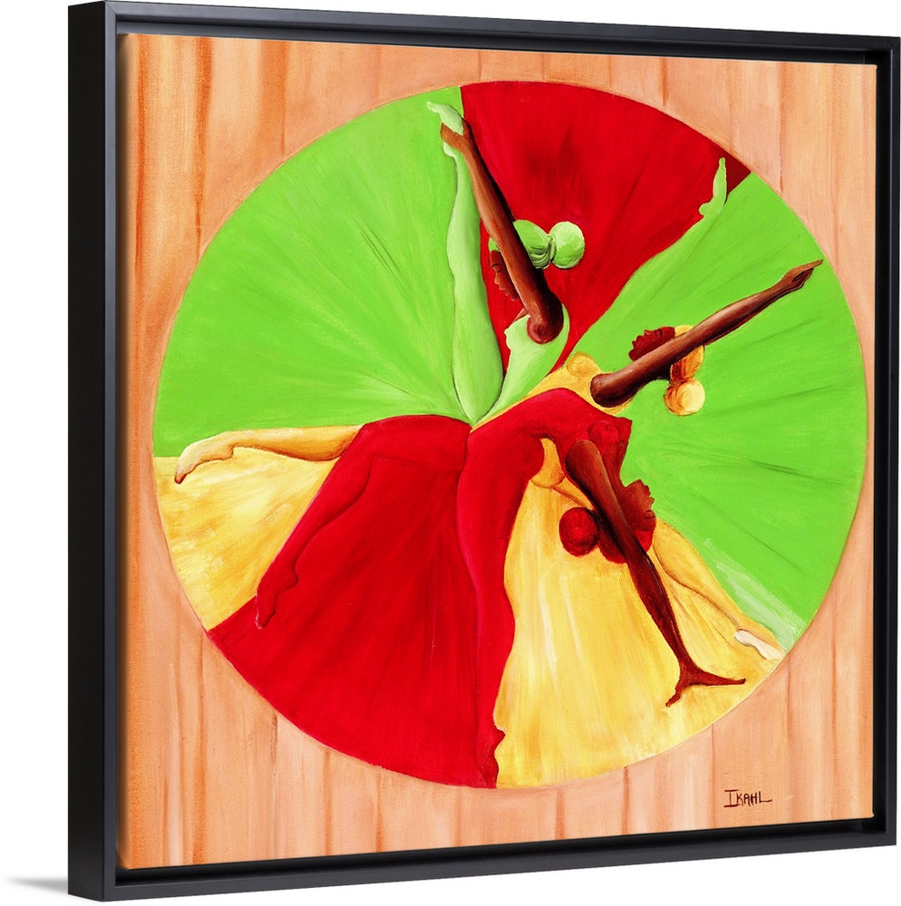 <p>Contemporary painting of three female African-American dancers moving with their dresses forming a circle.</p>