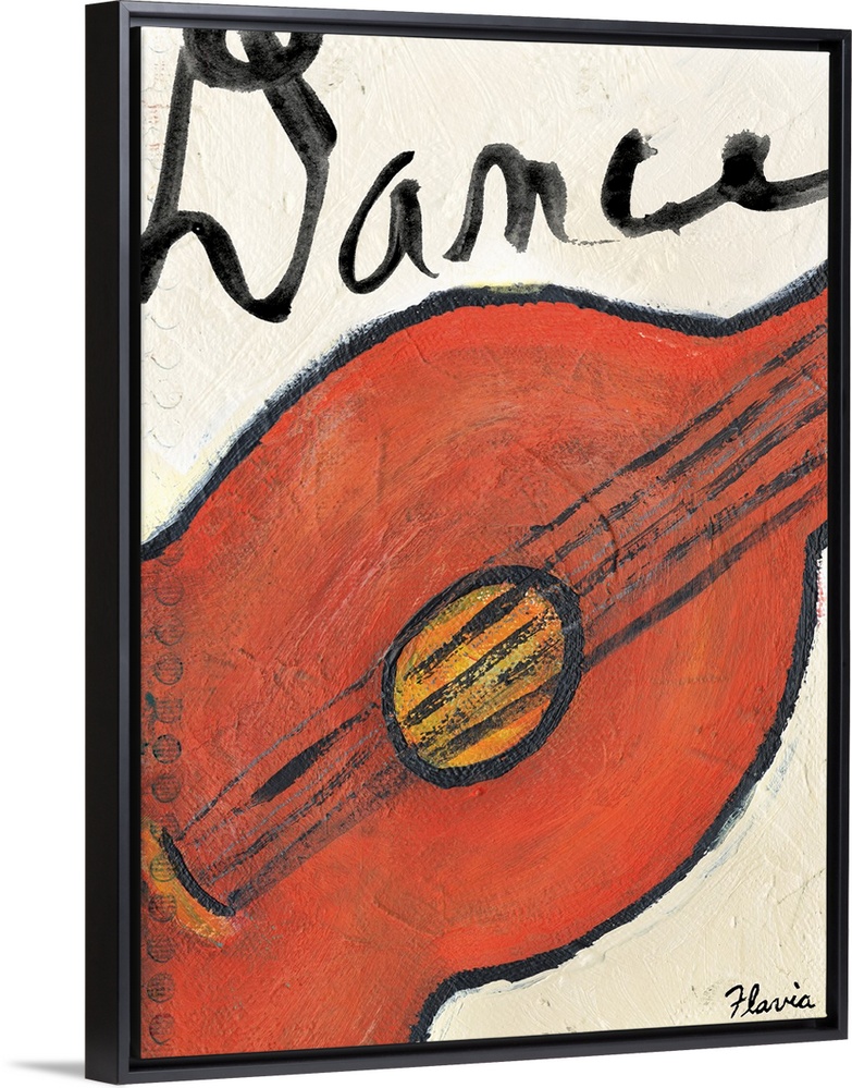 <p>Bright painting of a close up of a guitar with the word Dance on top of the image.</p>