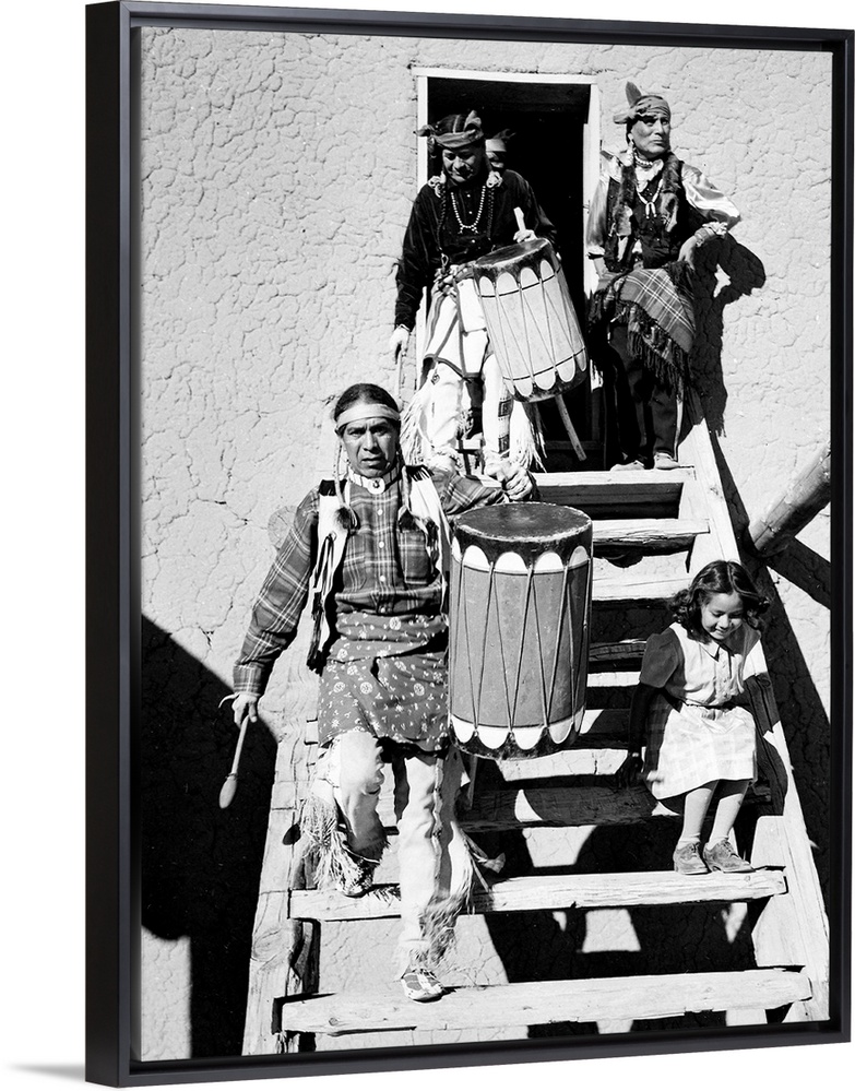 <p>Dance, San Ildefonso Pueblo, New Mexico, 1942, two Indians descending wooden stairs, carrying drums; another Indian and child near by.</p>
