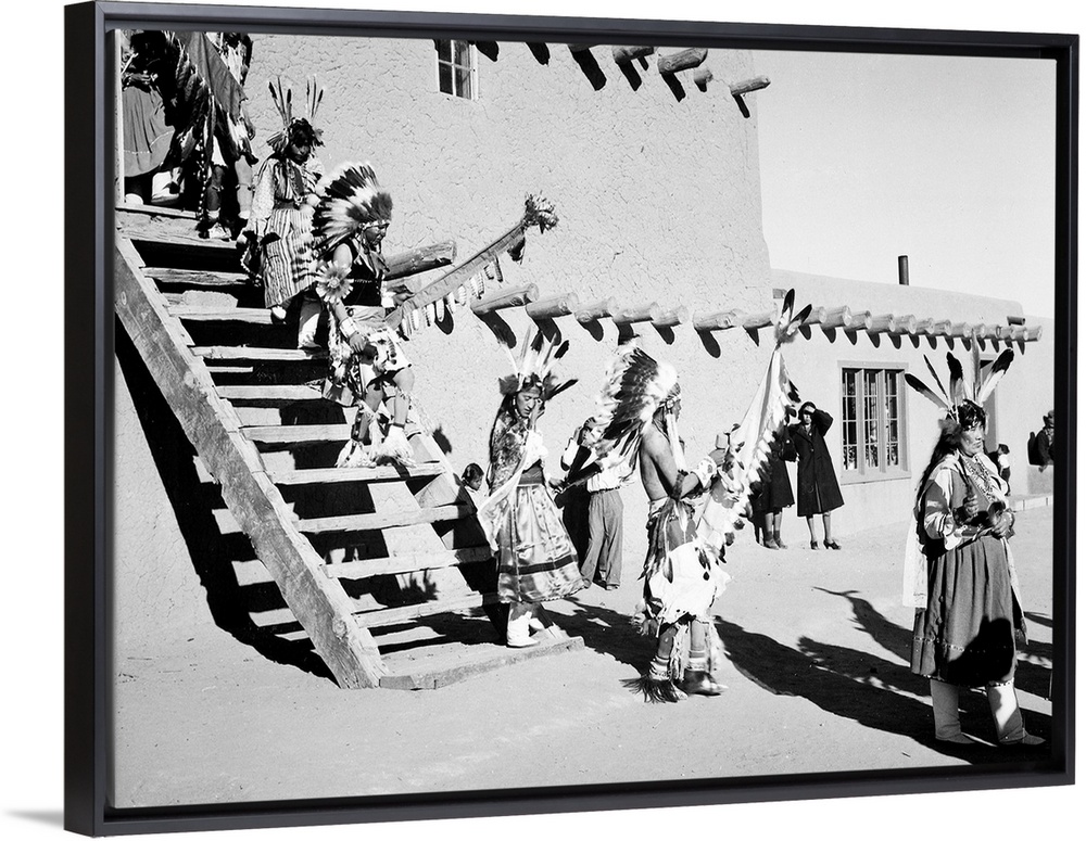 <p>Dance, San Ildefonso Pueblo, New Mexico,Indians in headdress, male and female, descending stairs.</p>
