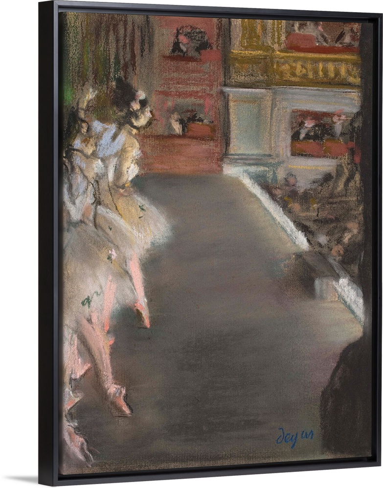 <p>Dancers at the Old Opera House, by Edgar Degas, 1877, French impressionist pastel drawing. Ballet dancers on Paris Opera House stage during a performance. This pastel drawing's untraditional composition concentrates the dancers on the left, with the empty</p>