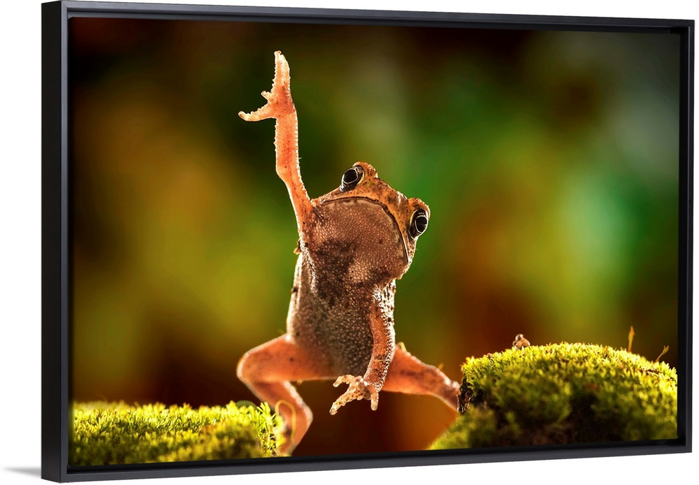 <p>A frog raising one arm up in the air in a funny pose.</p>
