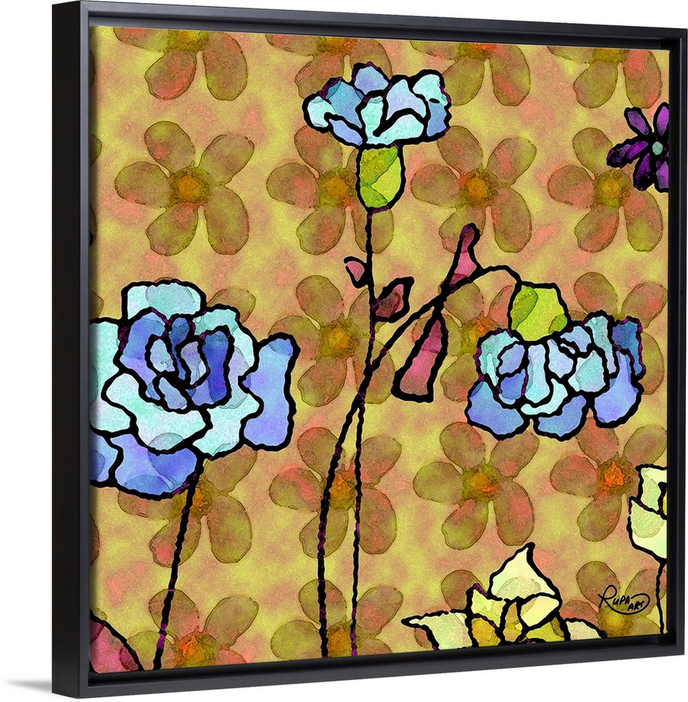 <p>Square abstract art with blue flowers outlined in black on a yellow and pink background with a floral pattern.</p>