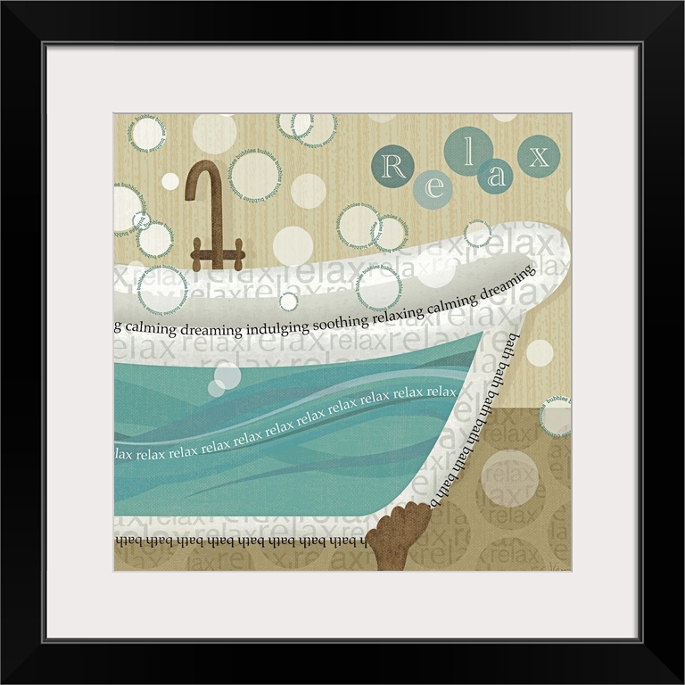 <p>Big, square home art docor of a semi-transparent antique tub nearly full of water, bubbles of various sizes float through the air, many of them surrounded by the word "bubbles", repeating itself. The outlines of the tub and part of the pattern in the floor have repeating text as well, such as "bath, relax, calming, dreaming, soothing, and relaxing".</p>