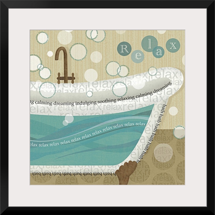 <p>Big, square home art docor of a semi-transparent antique tub nearly full of water, bubbles of various sizes float through the air, many of them surrounded by the word "bubbles", repeating itself. The outlines of the tub and part of the pattern in the floor have repeating text as well, such as "bath, relax, calming, dreaming, soothing, and relaxing".</p>