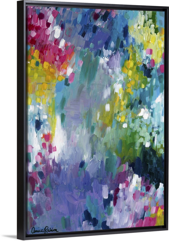 <p>Contemporary abstract painting in shades of purple, yellow, pink, and green.</p>