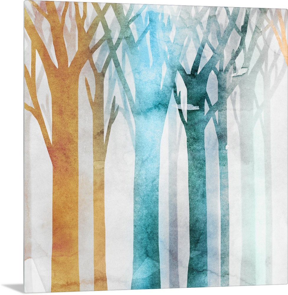 <p>Contemporary home decor artwork of colorful watercolor trees against a distressed background.</p>
