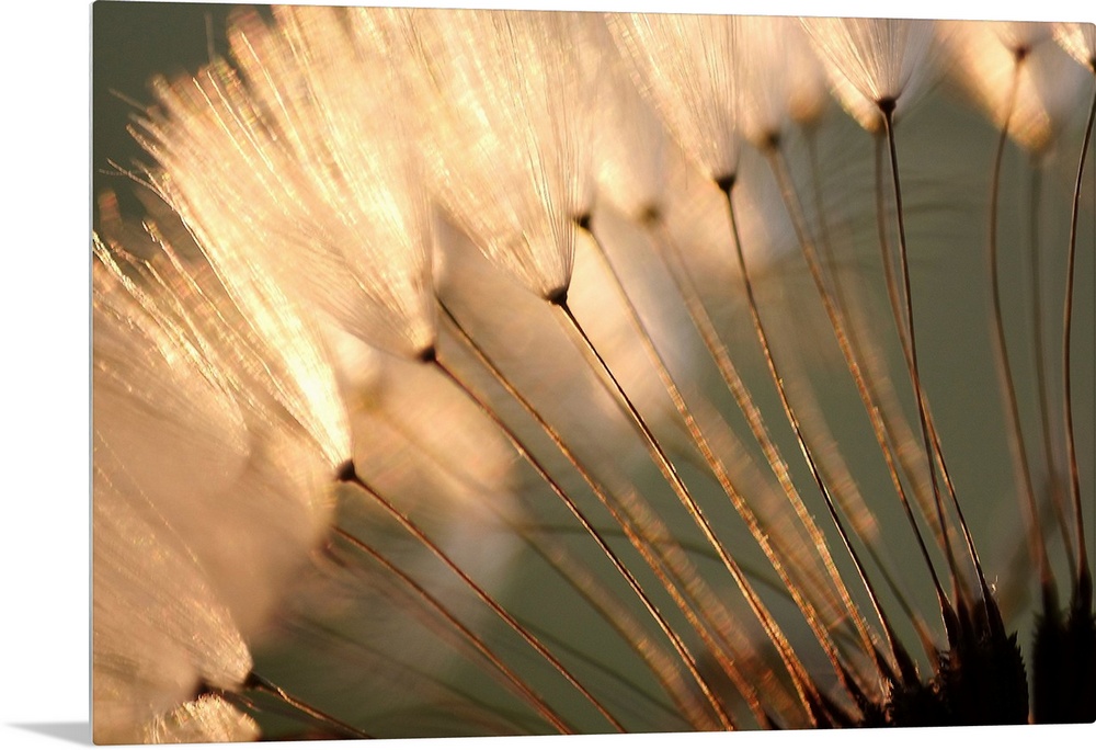 <p>Landscape close up photograph of white, fluffy dandelion seeds at sunset.</p>