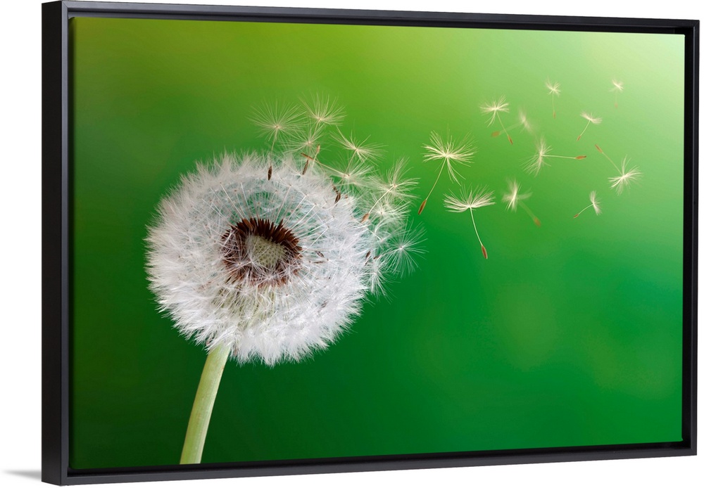 <p>Dandelion seeds in the morning sunlight blowing away across a fresh green background</p>