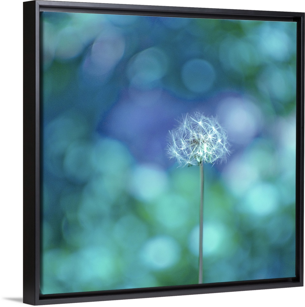 <p>A picture of a dandelion is taken against a glittering background of cool toned colors.</p>