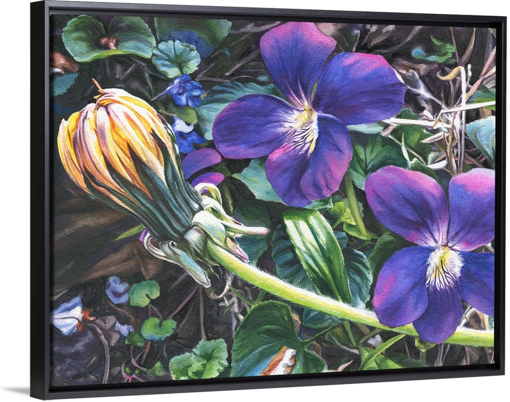 <p>Horizontal painting of two violet blooms with a dandelion crossing in front of them.</p>