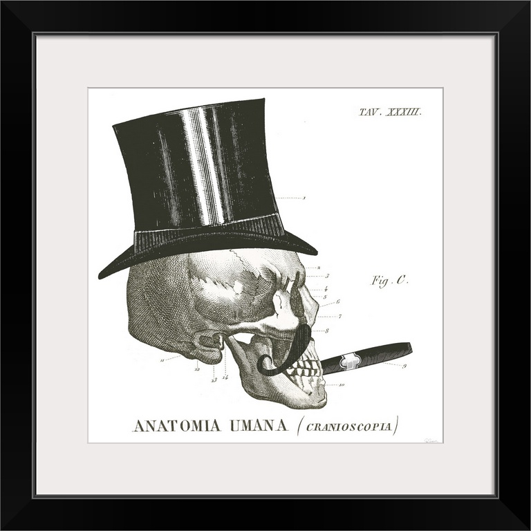 <p>Anatomical drawing of a human skull with a top hat and cigar.</p>