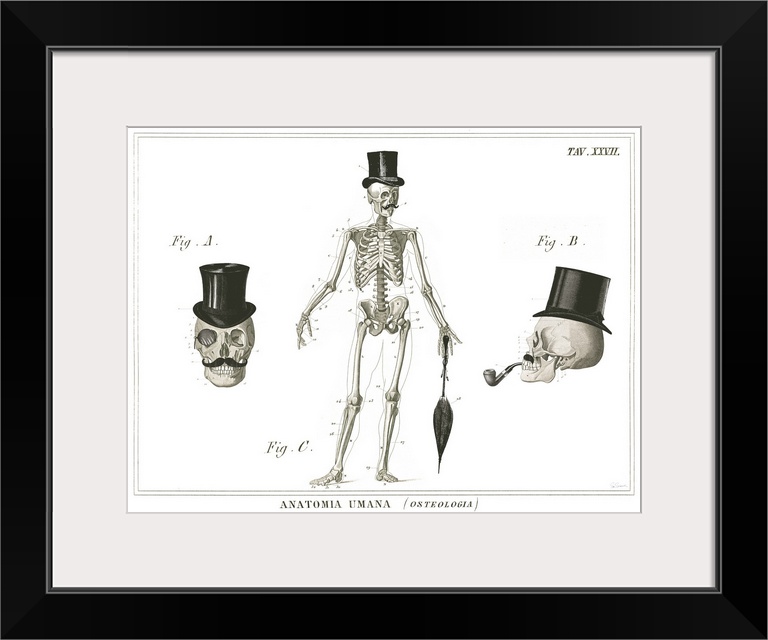 <p>Anatomical artwork of the human skull and skeleton wearing top hats.</p>