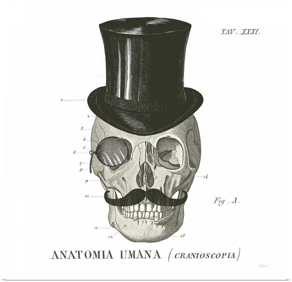 <p>Anatomical drawing of a human skull with a top hat and mustache.</p>