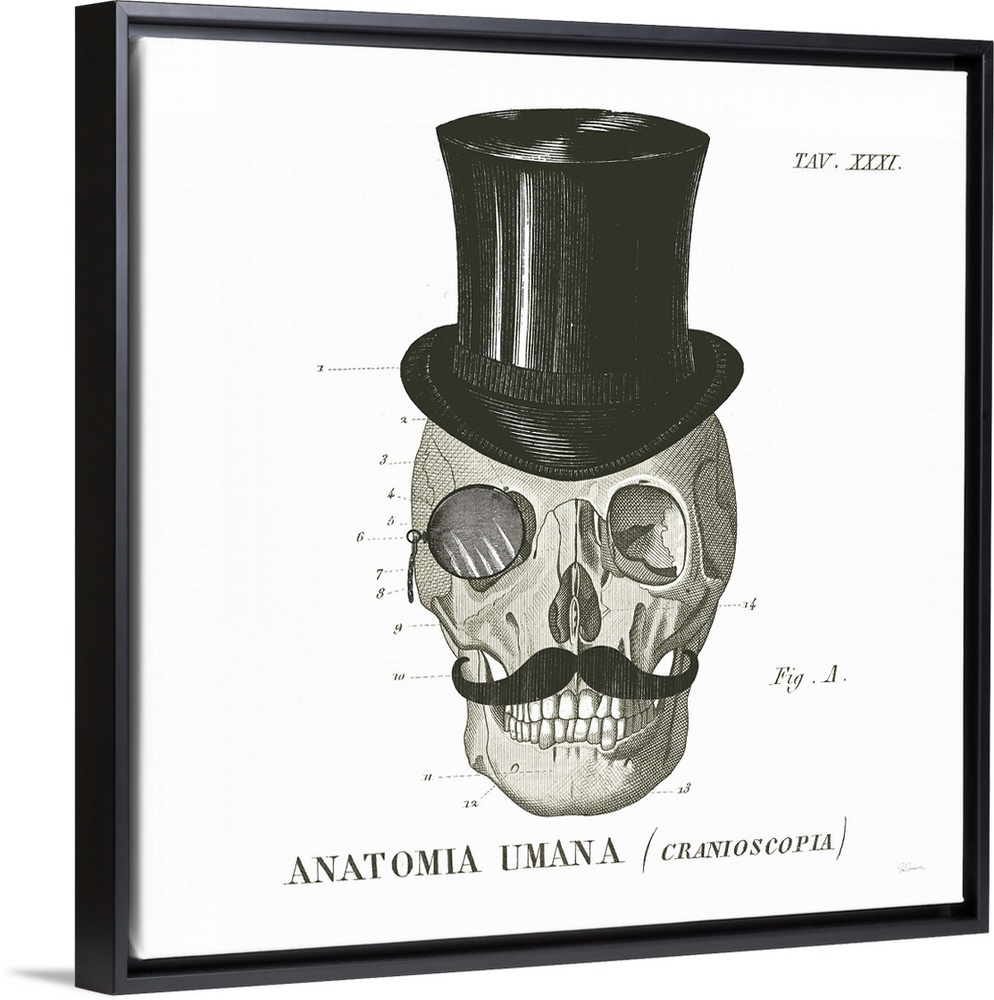 <p>Anatomical drawing of a human skull with a top hat and mustache.</p>
