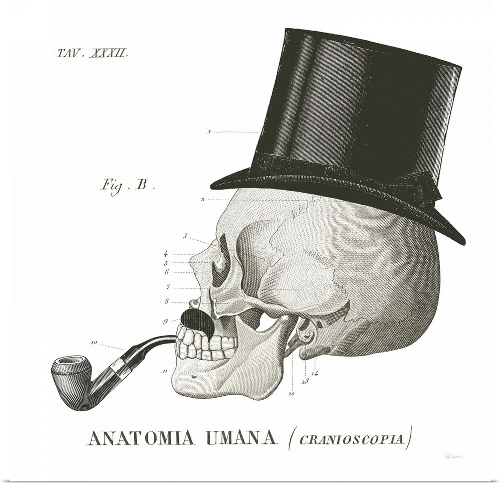 <p>Anatomical drawing of a human skull with a top hat and a pipe.</p>