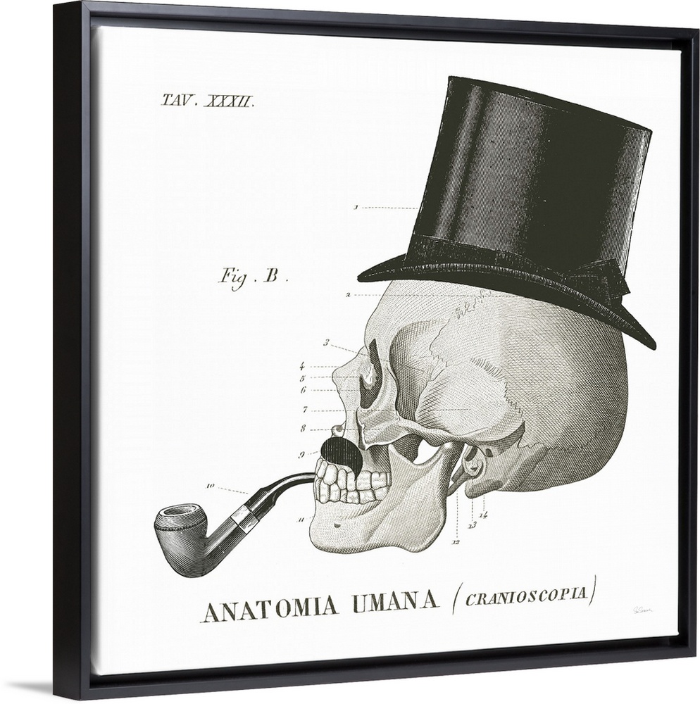<p>Anatomical drawing of a human skull with a top hat and a pipe.</p>