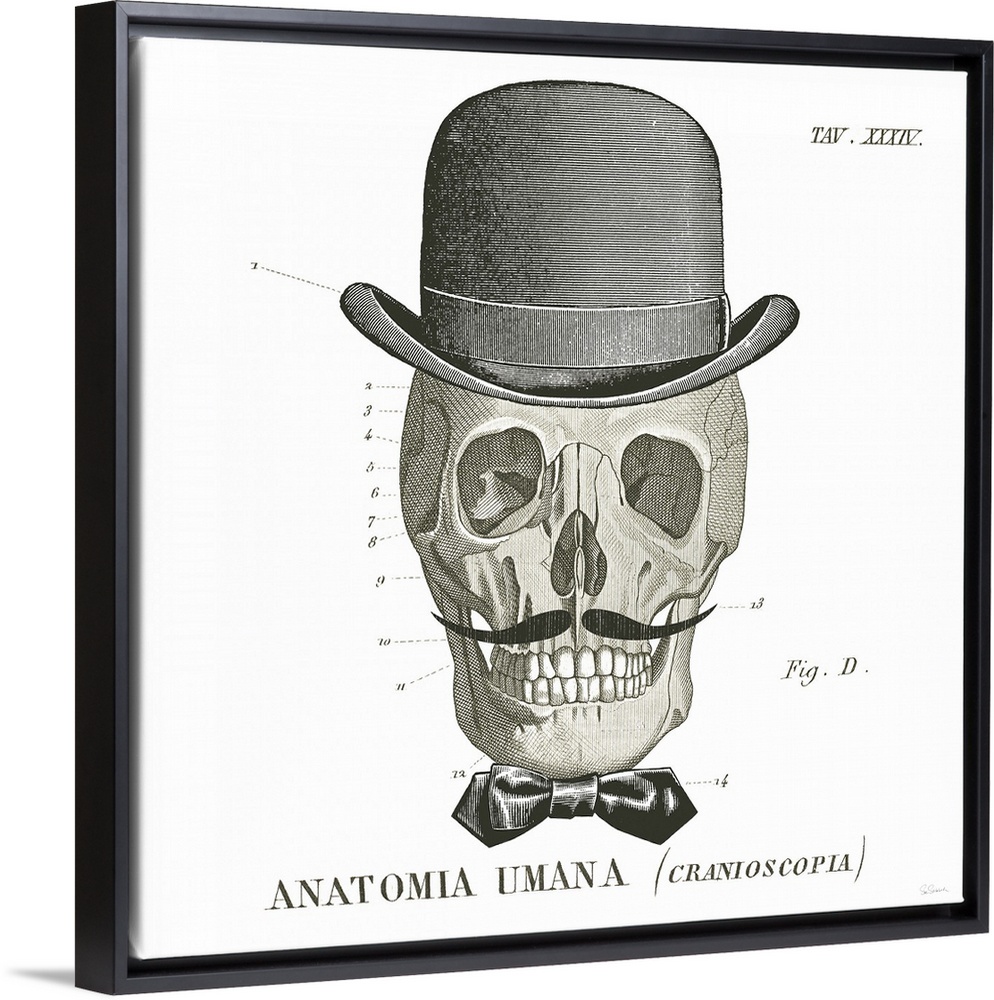 <p>Anatomical drawing of a human skull with a bowler hat and bowtie.</p>