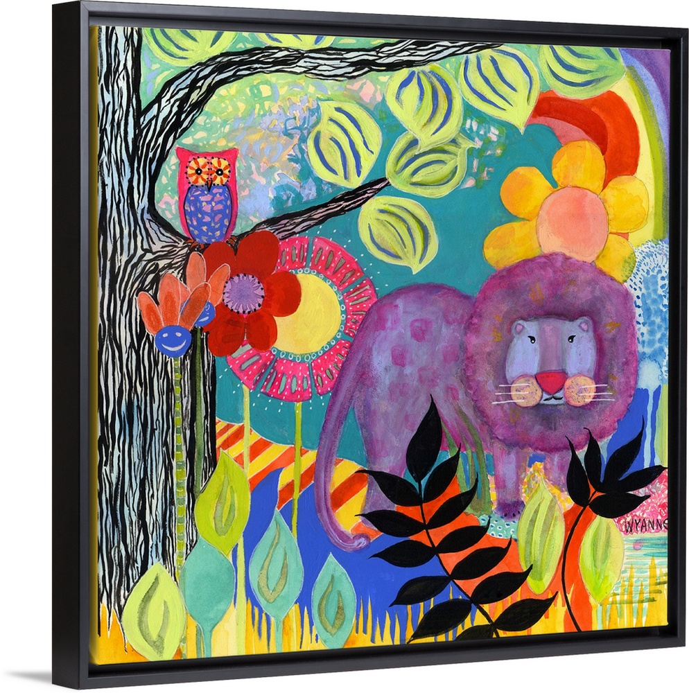 <p>A purple lion in a forest next to a tree with an owl.</p>