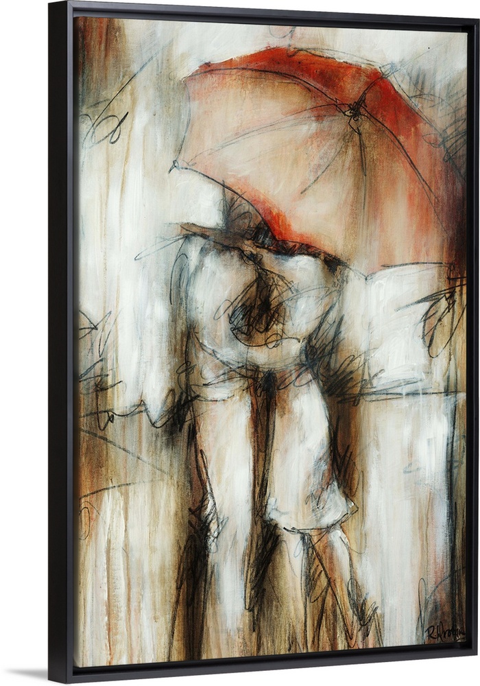 <p>Figurative art of a man and woman embracing, their faces covered by a large umbrella as color streaks vertically around them, giving the appearance of rain.</p>
