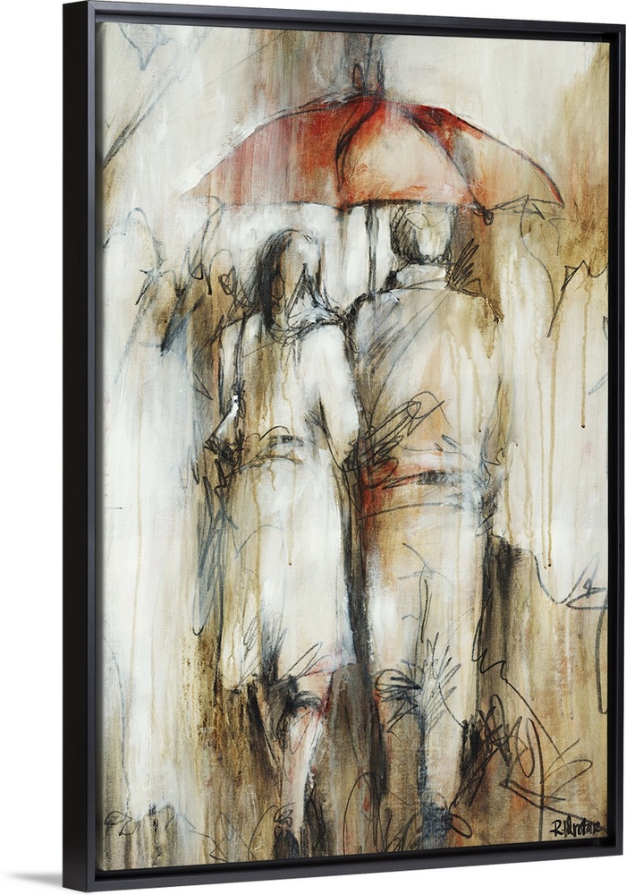 <p>Figurative art of the back of a man and woman walking together and holding a large umbrella, as color streaks vertically around them, giving the appearance of rain.</p>