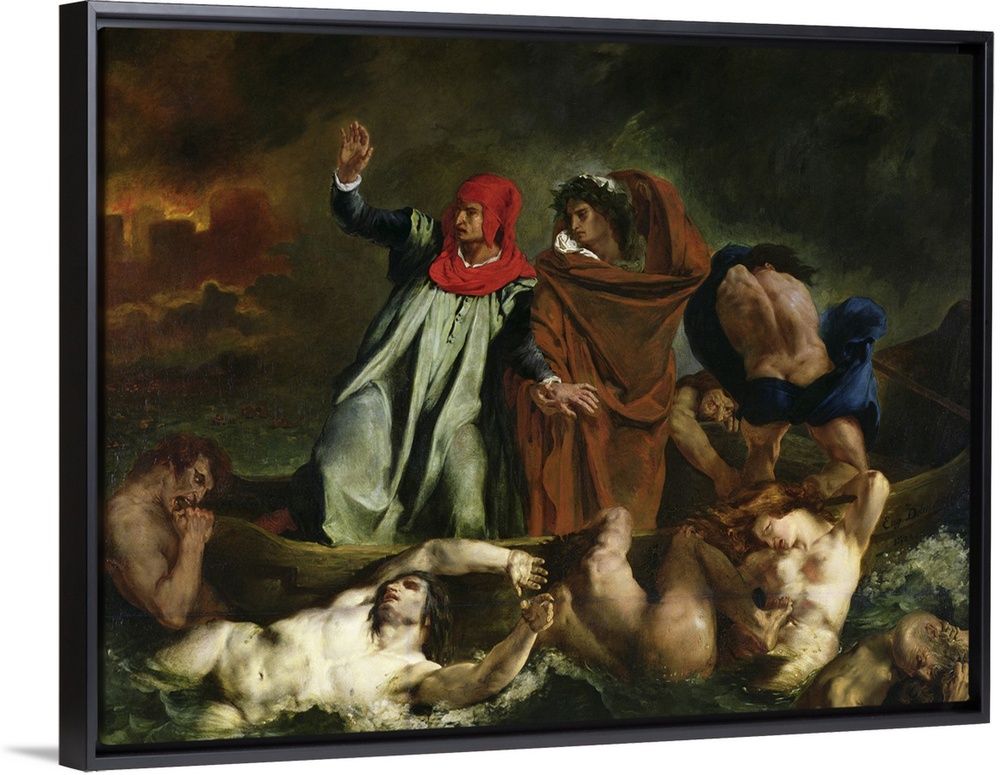 <p>XIR2996 Dante (1265-1321) and Virgil (70-19 BC) in the Underworld, 1822 (oil on canvas) by Delacroix, Ferdinand Victor Eugene (1798-1863); 189x241.5 cm; Louvre, Paris, France; (add. info.: Dante et Virgile, conduits par Plegias, traversant le lac qui entoure les murailles de la ville infernale de Dite, dit aussi La Barque de Dante); Giraudon; French, out of copyright</p>