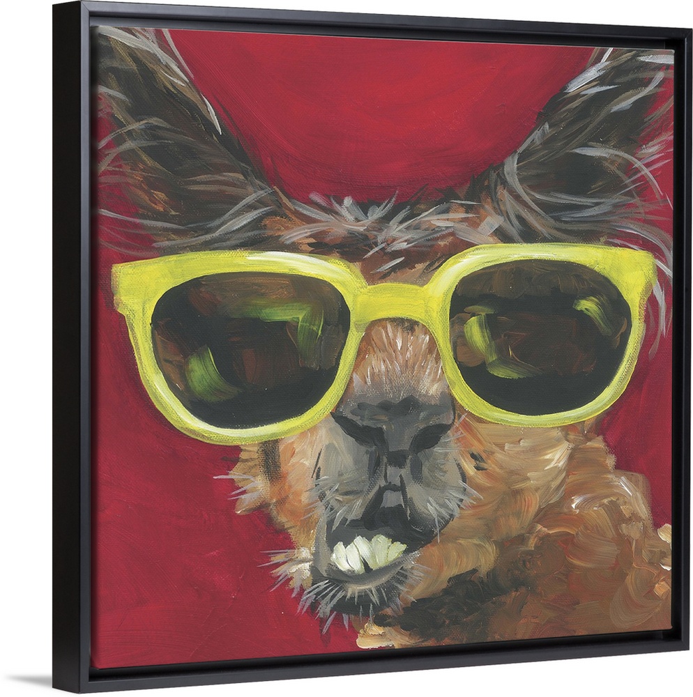 <p>A engaging portrait of a llama wearing yellow sunglasses on a red background.</p>