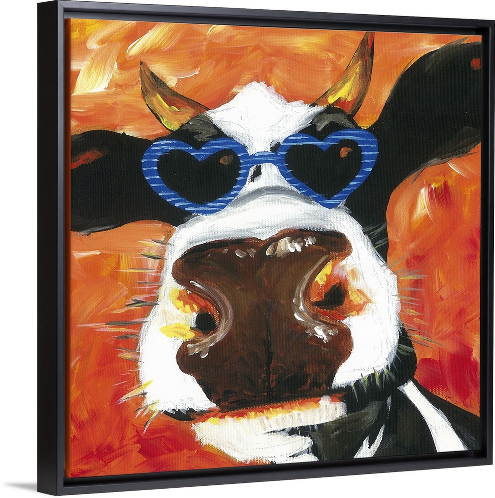 <p>A engaging portrait of a black and white cow wearing heart shaped sunglasses on an orange background.</p>