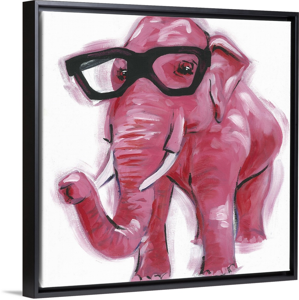 <p>A engaging portrait of a pink elephant wearing black glasses on a white background.</p>