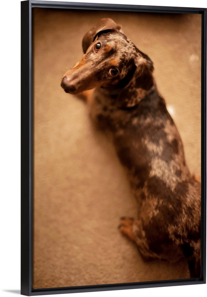 <p>Big brown eyed Dappled Dachshund looks up.</p>