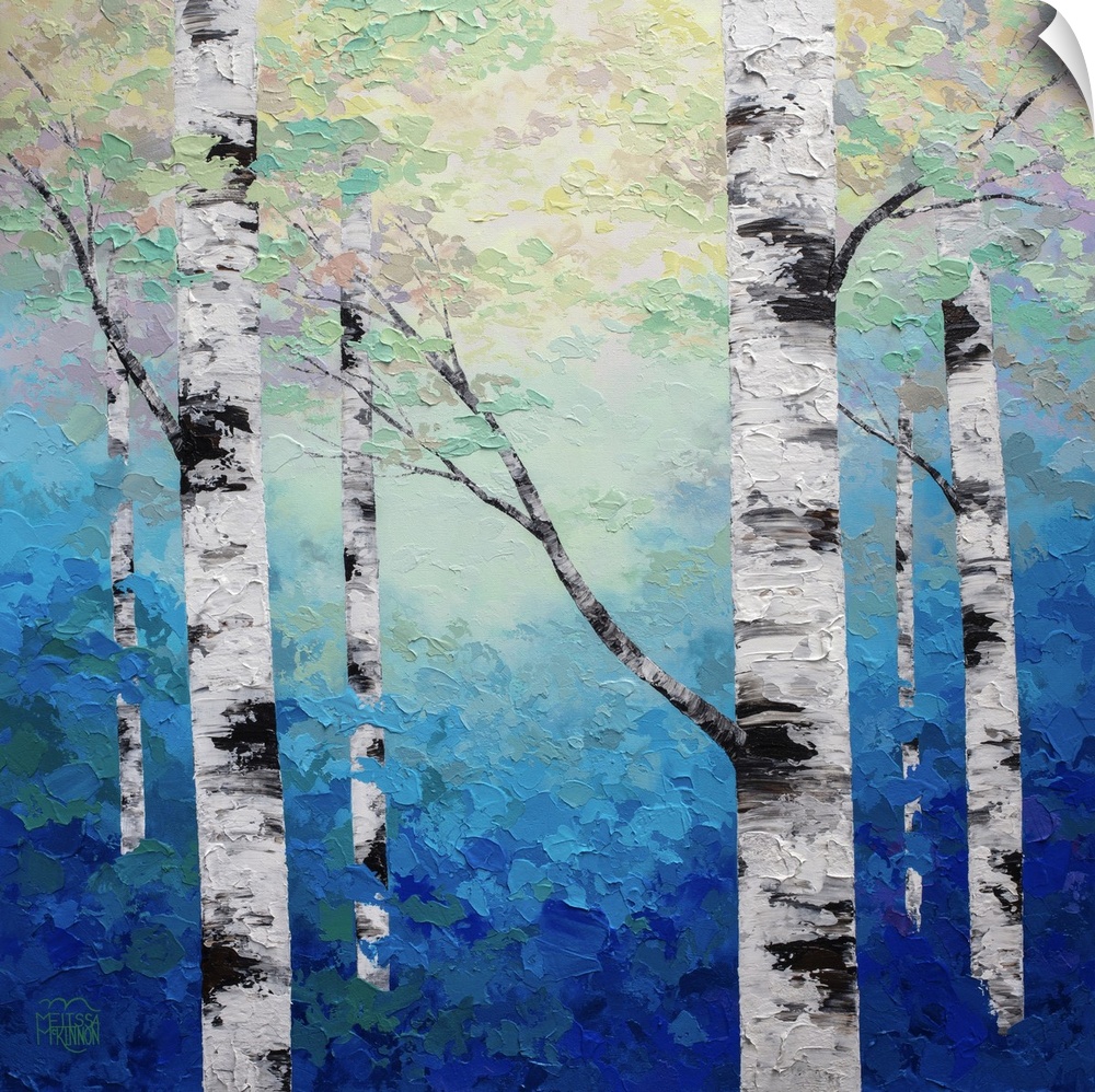 <p>Ethereal blue forest landscape painting of aspen trees and birch trees in sunlight Giclee art print on canvas by contemporary abstract landscape artist Melissa McKinnon painted with palette knife and impasto texture.</p>