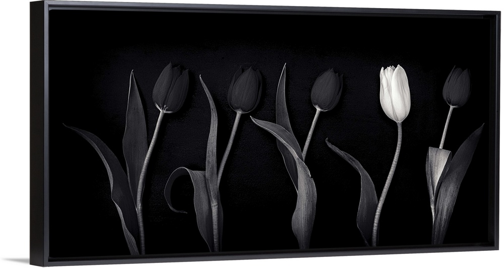 <p>A black and white monochrome panorama of tulips with one white tulip standing out as an individual.</p>